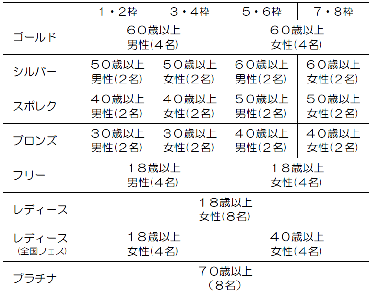 | 種目 | 1)ゴールド の部 2)シルバーの部 3)スポレクの部 4)ブロンズの部 5)フリーの部 6)レディースの部(高校生は不可) ※全国フェスティバル出場希望のチームは、18歳以上2名、40歳以上2名の構成にすること。 7)プラチナの部 |